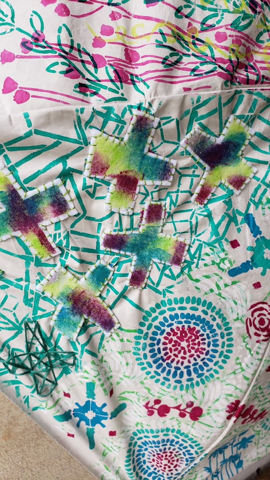 There were two other opposite sections that I cut out irregular 'X' from a stencil and tried the same technique, but it did NOT work the way I wanted to. So I grabbed a piece of white felt and applied paint through that stencil onto the felt. After it was dry, I cut them out and sewed the shapes over the cutout 'X' shapes on the umbrella. Problem solved!